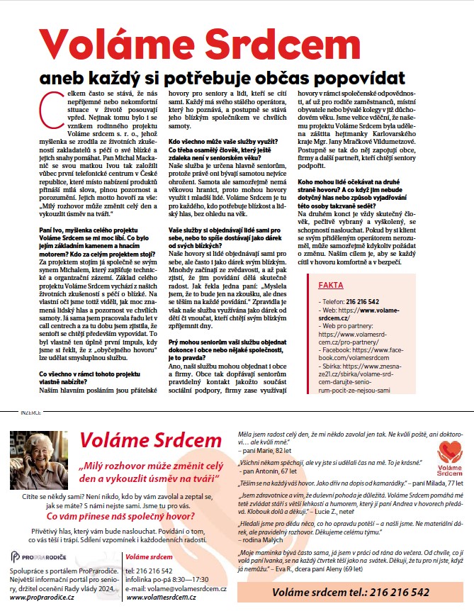V regionálním magazínu Náš kraj deníku MF DNES vyšel článek o projektu Voláme Srdcem. Píše o tom, proč je důležité mít možnost si popovídat a jak naše hovory pomáhají seniorům i jejich blízkým.